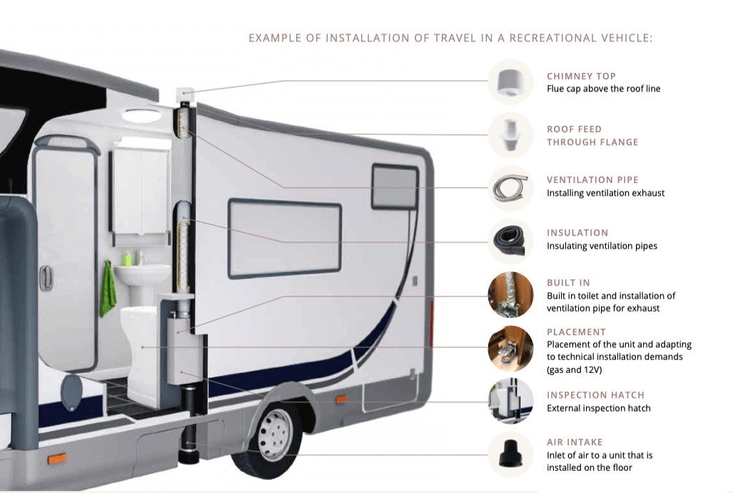 Cinderella Travel Cinderella Travel can be retrofitted into existing Campers, RV’s, boats and mobile homes. This will require replacing old toilets, applies access to 12V control power and LPG Gas in addition to ensuring adequate air supply to the toilet. You must also install an exhaust pipe from the toilet that goes up beyond the roof. We recommend you have the installation performed by expert professionals to ensure maximum performance.